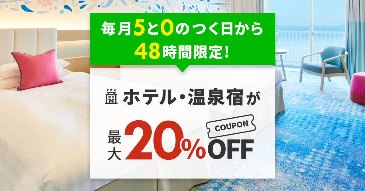 毎月5と0のつく日から48時間限定!楽天トラベルのホテル・温泉宿のご予約がクーポン利用で最大20%OFF!クーポンを獲得...