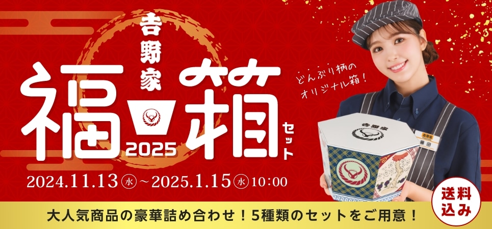 【吉野家】は2025年福箱を11月13日~2025年1月15日(水)10:00まで販売。【松】、【竹】、【梅】のほかに2025年の干支【巳】の箱も。