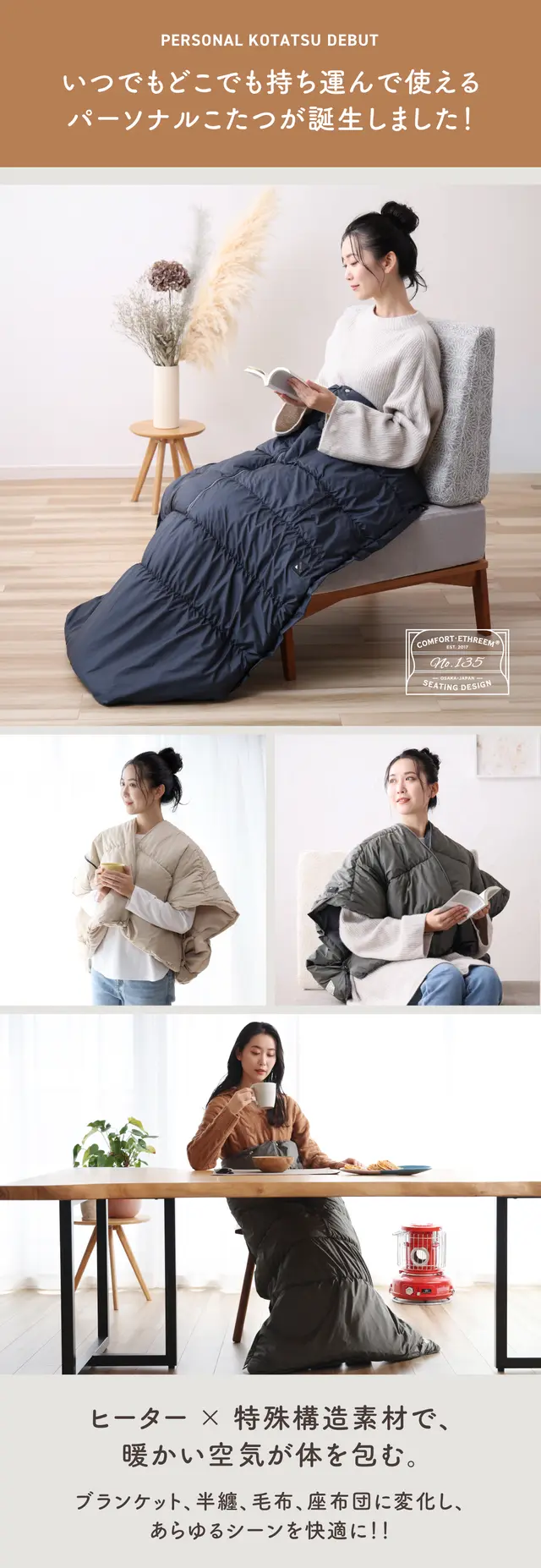 「パーソナルこたつブランケット」は、どこでも簡単にこたつ気分を味わえる便利アイテムです。