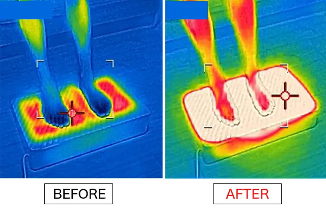 この製品の特徴は、足を乗せるだけでじんわりと自然にポカポカと温まる点。熱伝導率が極めて高い特殊な加熱シートを使用しており、熱効率が高く、電気代を節約しながら快適に過ごせます。